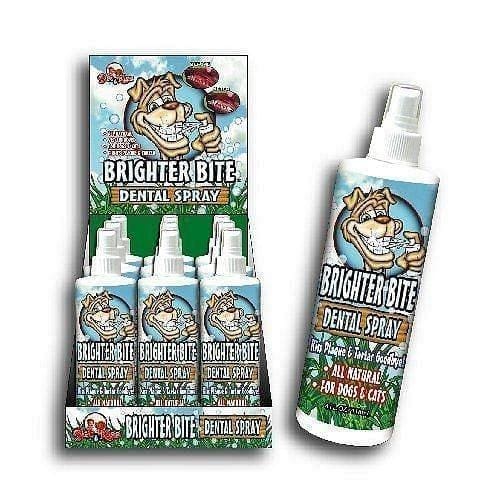 Did you know that by age three, 80% of dogs and cats show signs of oral disease which can lead to serious health problems? For pet lovers at home or on the go — now you can provide your dog or cat with daily oral hygiene care using Brighter Bite Dental Spray — a convenient all-in-one natural spray for fresher breath and cleaner teeth. Simply spray into your pet’s mouth daily, covering teeth and gums, and relax! The spray dissolves instantly as all-natural ingredients work together to promote better oral health for your pet without any brushing required. The spray is made from a natural blend of zinc, chlorophyll, propolis, grapefruit and vanilla mint. Try our Brighter Bite Dental Spray and give your pet a healthier life — naturally!