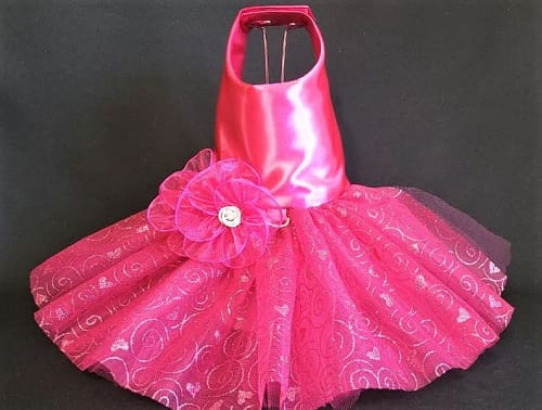 This lovely tutu harness dress has a luscious fuchsia satin top and is lined for comfort. At the waist, there is a striking fuchsia flower with large crystal center and accent petals, which is removable for easier cleaning of the dress. The full fuchsia tutu has a top layer of silver sparkle tulle. There is a crystal D-Ring at the waist for extra bling.