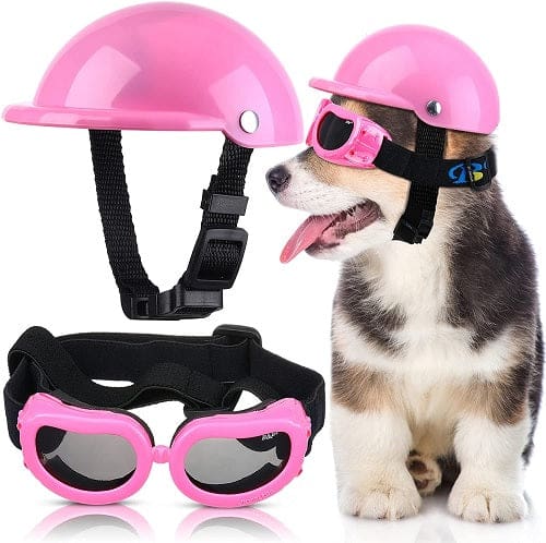 Adjustable strap design: the protective cool glasses are designed with an adjustable double strap for head and chin, and the pet helmet is designed with an adjustable and flexible nylon chin strap, which can be adjusted and tightened according to your puppy's size, buckles closure makes it convenient to wear.